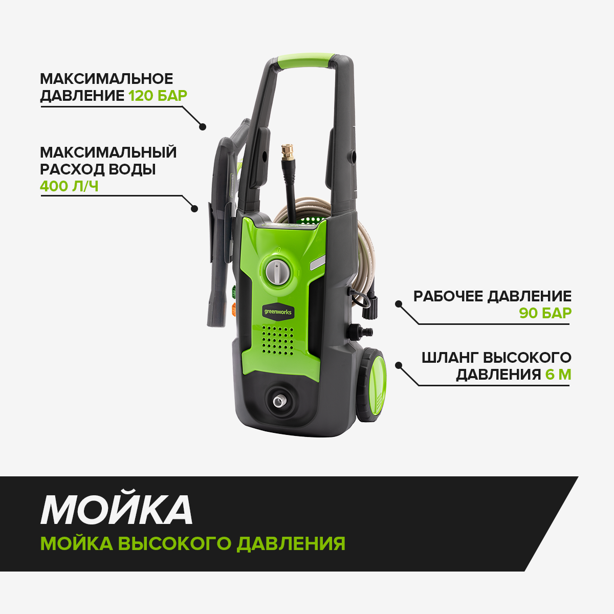 Электрическая мойка высокого давления Greenworks GPWG3II (5107007) мощностью 1700 Вт и давлением 120 бар — это надежный и функциональный помощник для тех, кто ценит качество и удобство в уходе за своим домом и участком. ✅Эта легкая и компактная мойка легко справится с очисткой придомовых территорий, садового инвентаря, декоративных покрытий на небольшом приусадебном участке и велосипедов. Она также подойдет для несильно загрязненной авто- и мототехники. ✅Двигатель мощностью 1700 Вт обеспечивает производительность 400 л/час и максимальное давление 120 бар. Надежная алюминиевая помпа с плунжерами из нержавеющей стали гарантирует долговечность устройства. При отпускании курка пистолета система Full Stop останавливает двигатель и сбрасывает давление, что позволяет экономить ресурс мойки. ✅Мойка может работать как в горизонтальном, так и в вертикальном положениях. В комплект поставки включены все необходимые принадлежности для качественной мойки различных поверхностей: пистолет и трубка из