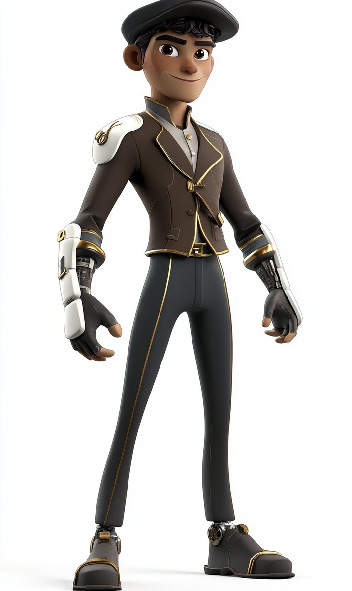 Создано на основе запроса: create a stylized 3D character for an animation in a style fitting for 2025 dreamworks movies. The character is an young italian from the future with a stereotypical cultural italian outfit in dark brown with gold linings, styling, flat cap, and grooming. But also part of his neck, shoulders and arms have futuristic sci-fi accessories in white. Show full body --- Автоперевод: Создайте стилизованный 3D -персонаж для анимации в стиле, подходящем для фильмов DreamWorks 2025. Какое твое впечатление? 🤔 https://dzen.ru/id/65c0c65c86e4f837c27b24d7 #ИИ #AI #нейросеть #midjourney #art
