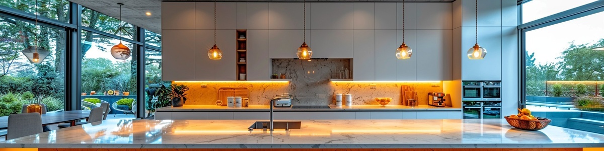 Создано на основе запроса: A photorealistic banner showcasing a stunning kitchen remodel with sleek countertops, high-end appliances, and a stylish backsplash. The left side features the contemporary kitchen design, seamlessly transitioning to a solid, neutral-colored wall on the right for clear text placement. Include elegant pendant lighting and a spacious layout for an inviting atmosphere.