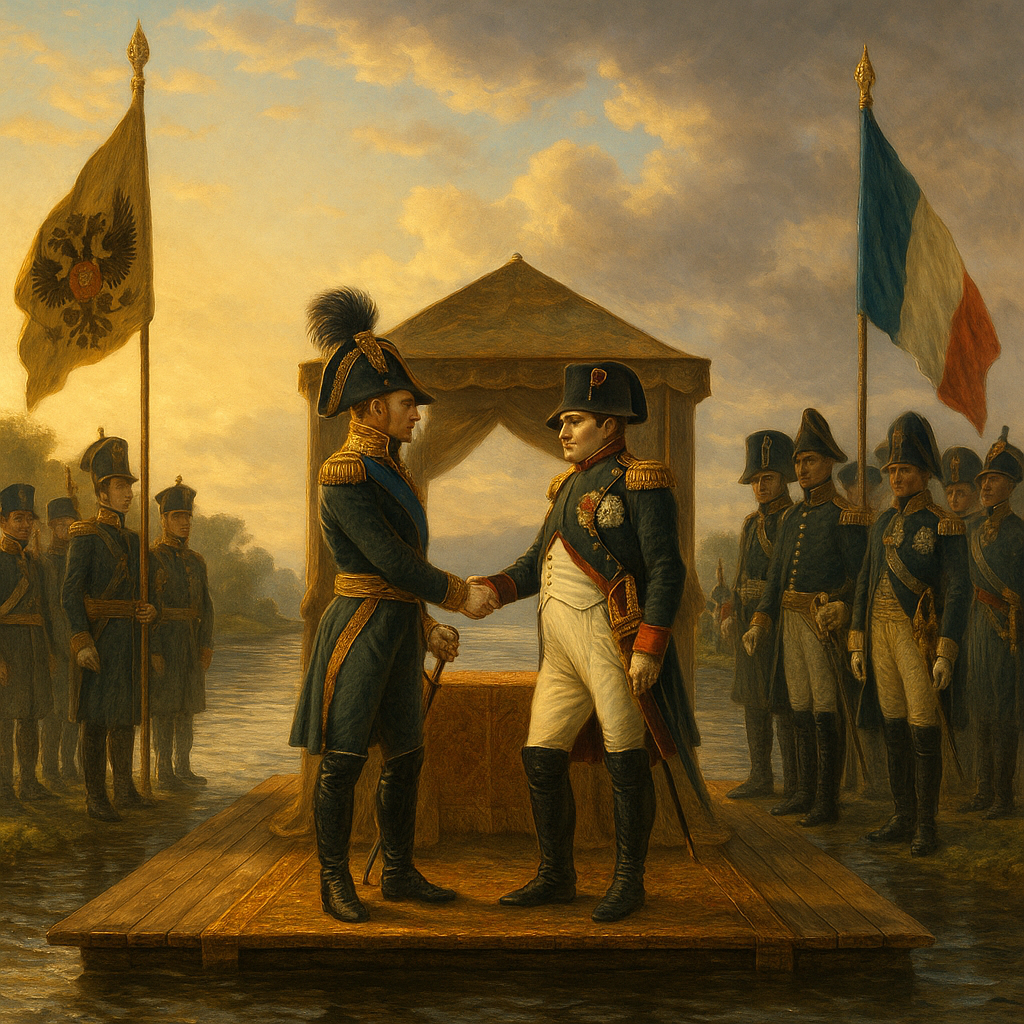 Итак, 1807 год. Европа пытается переварить очередную порцию наполеоновского величия. Французский император только что разгромил Пруссию и заставил Россию, потерпевшую поражение при Фридланде, сесть за стол переговоров. Два императора — Александр I и Наполеон — встречаются на плоту посреди реки Неман у города Тильзит. В результате рождается знаменитый Тильзитский мир, по которому Россия присоединяется к континентальной блокаде Англии.