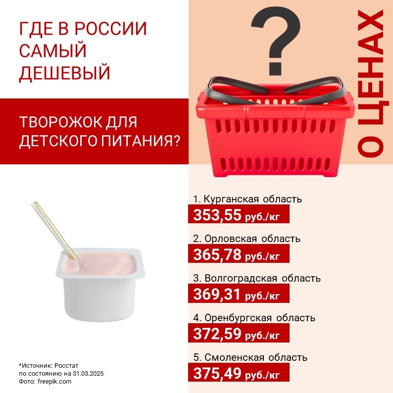 «Центр Агроаналитики» определил топ-5 регионов страны с самыми доступными ценами на творожок для детского питания и творожные сырки, глазированные шоколадом, в расчете за килограмм. Наиболее выгодная стоимость детского творожка установилась в Курганской области УФО. Остальные четыре места в рейтинге у следующих областей: Орловской и Смоленской ЦФО, Волгоградской ЮФО и Оренбургской ПФО. Что касается творожных сырков в шоколадной глазури, то ниже всего цены на них в Чеченской Республике СКФО. Также в топ-5 субъектов попали три области ЦФО: Белгородская, Липецкая, Воронежская — и Республика Башкортостан ПФО.