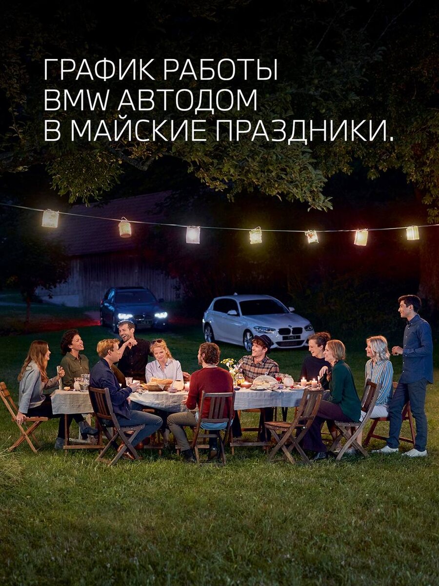 Дорогие друзья и партнеры! 🌱Поздравляем вас с наступающими майскими праздниками. 💛Желаем вам отдохнуть, зарядиться энергией на природе или дома, вдохновиться новыми идеями и с новыми силами вернуться к рабочему ритму. 🚴🏻Мы с вами на финишной прямой, скоро лето! График работы BMW АВТОДОМ в майские праздники: г. Москва 🚙Автодом Зорге Продажи: с 9:00 до 21:00 Сервис: c 7:30 до 22:00 🚙Автодом МКАД Продажи: с 9:00 до 21:00 Сервис: c 8:00 до 22:00 🚙Автодом Внуково Сервис: c 8:00 до 21:00 🚙Автодом Шмитовский Сервис: c 9:00 до 21:00 🚙Автодом Вернадский Сервис: c 8:00 до 21:00 г. Санкт-Петербург 🚙Автодом Стартовая Продажи: с 9:00 до 21:00 Сервис: с 9:00 до 21:00 Подробную информацию о работе дилерских центров вы можете уточнить по телефонам: г. Москва +7 (495) 153 22-45 , г. Санкт-Петербурге +7 (812) 210-40-63.