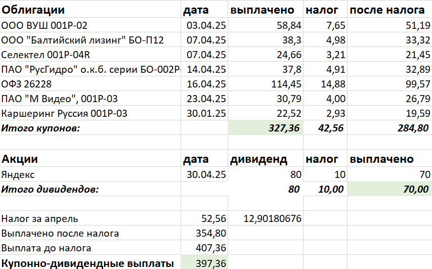 Вот и заканчивается уже второй месяц весны. А это значит, уже пора подводить итоги апреля. И начну я по традиции с инвестиционных. В апреле у меня получилось неплохо пополнить брокерский счёт: Итого 11600 рублей пополнений с активного дохода. Кроме того, в апреле я выполняла разные задания от брокера. Вообще задания появляются регулярно, но в этом месяце они довольно сильно совпадали с моими планами покупок. Поэтому в апреле я получила 530 рублей подарочными акциями, которые сразу же продала. К слову, мне пришли ещё 200 подарочных рублей на инвесткопилку, но я их нигде не учитывала. На рынке почти каждое высказывание политиков вызывает какой-то неоправданный ажиотаж, волатильность дикая. К тому же, ЦБ предсказуемо оставил ключевую ставку на уровне 21%. Наиболее логичным для себя вижу в такой ситуации делать акцент на покупку консервативных ОФЗ, а также наращивать позиции в качественных эмитентах акций в моменты паники рынка. На моментах подъемов рынка в апреле совершила пару спе