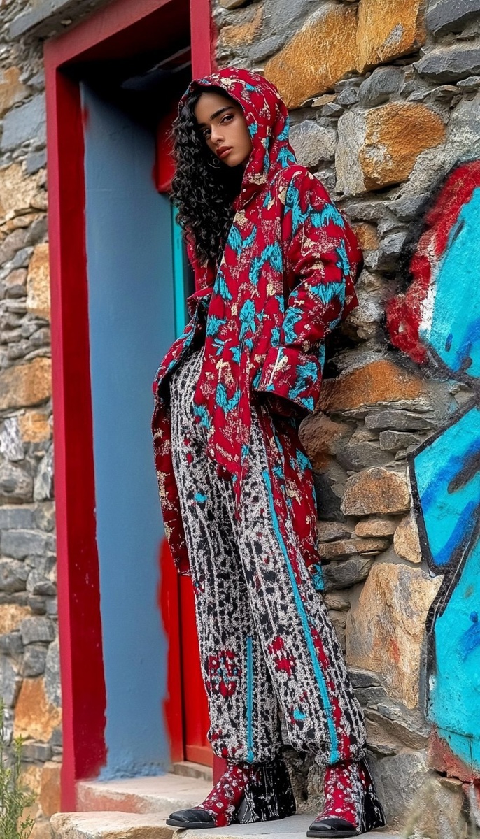 Создано на основе запроса: young model wearing loud Desi Hip-Hop streetwear in a remote Himalayan village setting, khadi kurta reimagined as