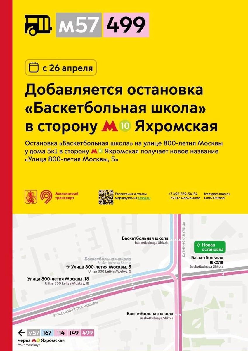 🚌 Для двух маршрутов с 26 апреля появится остановка «Баскетбольная школа» в сторону метро «Яхромская»