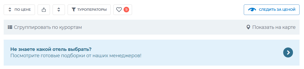 Выбираем город вылета, страну — Турция, даты вылета, количество ночей, состав туристов, нужные фильтры. После того, как появится выдача, над первыми результатами можно видеть следующий баннер: