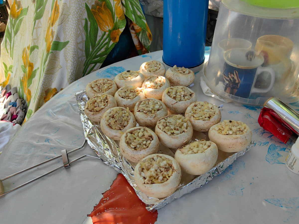 Приближаются длинные майские выходные. Кто-то берет отпуск и улетает в путешествие. Кто-то проведет праздники на даче. Для тех, кто планирует выходные поработать на своем участке, знает, что после продуктивной работы очень важно вкусно поесть. Предлагаем вам рецепт вкусного обеда на свежем воздухе. Для этого нам понадобится: Шампиньоны - 15-20 желательно покрупнее. Сыр для пиццы. Лук. Чеснок. Майонез. Соль, специи. У грибов вырезаем ножки, шляпки откладываем в сторону. Затем мелко нарезаем (шинкуем) ножки грибов. В получившуюся массу добавляем, предварительно, нарезанный лук и чеснок. Заправляем нашинкованную массу майонезом, можно добавить немного ароматного, душистого молотого перца по вкусу. Перемешиваем и заправляем получившуюся начинку в шляпки шампиньонов. Сверху посыпаем каждый гриб тертым сыром. Наша будущая вкуснятина готова, для помещения ее на решетку. Теперь самое время разжечь костер. Как только дрова прогорят и останутся одни угли, выкладываем наши грибы на решётку и