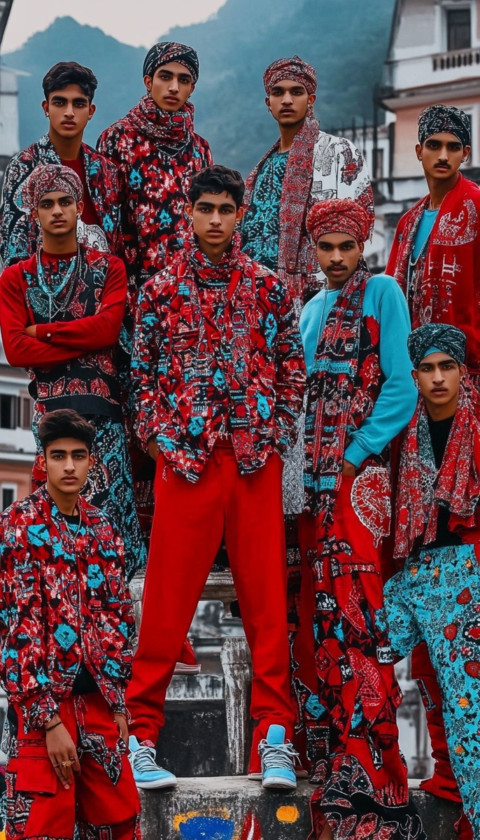 Создано на основе запроса: group of diverse South Asian youth in bold sustainable streetwear, motifs inspired by DHH, standing on rooftops in Uttarakhand, rap poses, loud colors, layered outfits, bandanas, mics, dynamic composition, cinematic street scene, dusk lighting