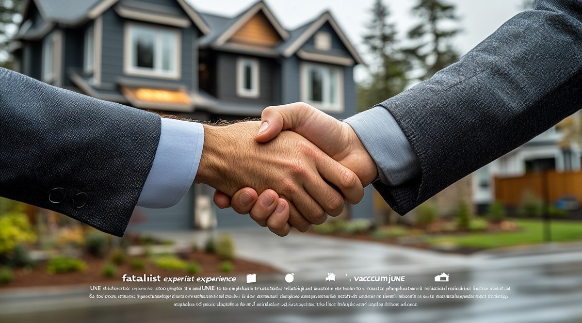 Создано на основе запроса: Create an impactful visual of real estate agents shaking hands with home kerb side, include icons for " fatalist