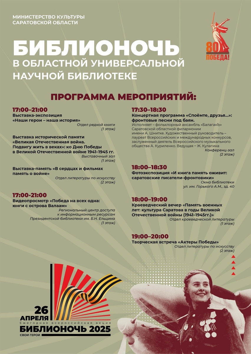 Библиотека принимает участие в ежегодной всероссийской акции «Библионочь», которая пройдёт под девизом «Нет в России семьи такой, где б не памятен был свой герой». 26 апреля в 17.00 мероприятия «Библионочи» начнутся в историческом здании Областной библиотеки по адресу: ул. им. Горького А.М., зд. 40. Программа Библионочи здесь 🔗 https://clck.ru/3LegAE