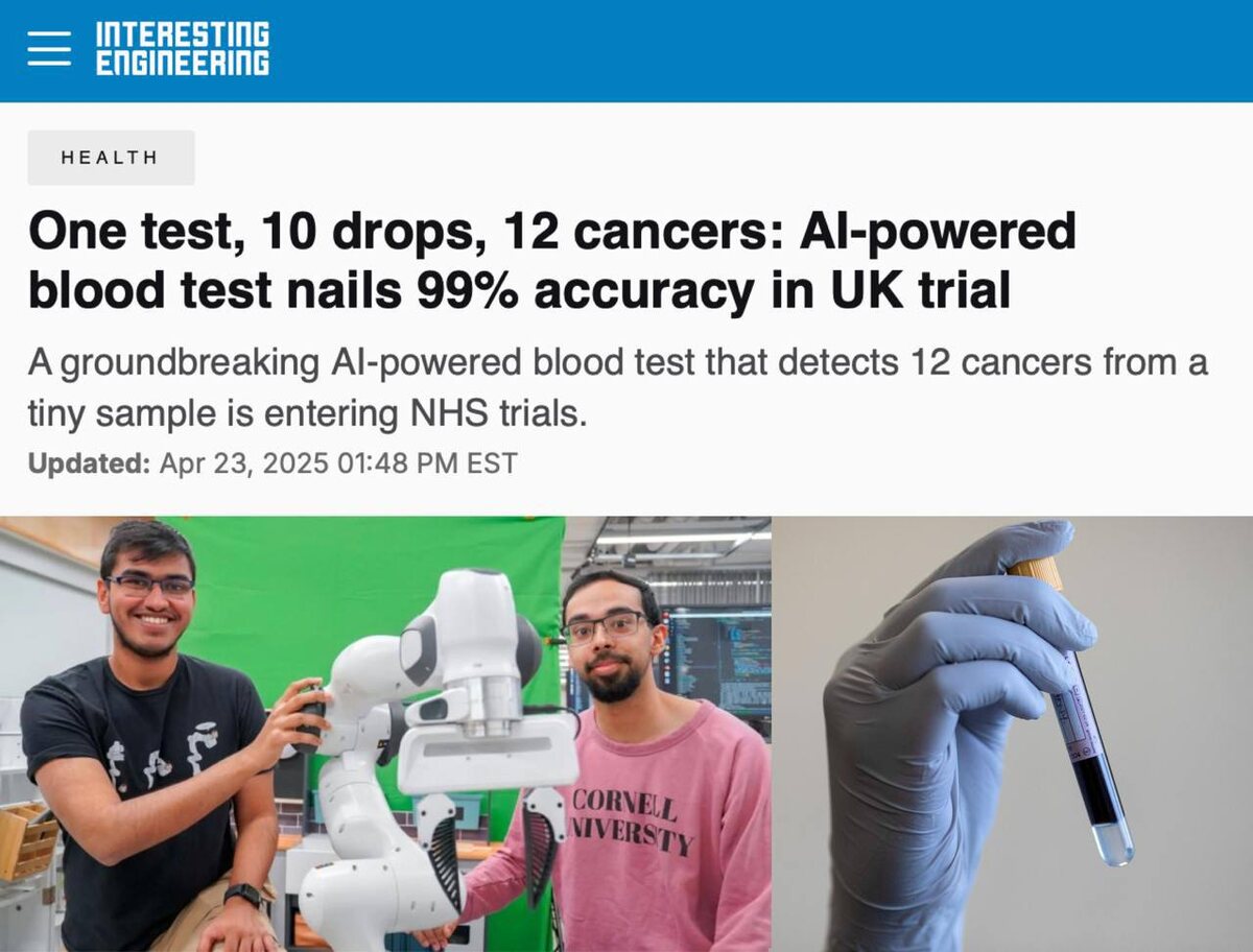 В Англии был представлен анализ крови, способный выявить до 12 видов рака еще до появления симптомов. Всего требуется 10 капель, и алгоритм не только обнаруживает опухоль, но и указывает её местоположение в организме. Новинку протестировали на 20 тысячах людей, и результаты впечатляют — точность составляет 99%. NeuroFlux #ИИ #Технологии #наука #нейросети #ИнтернетСвобода #ИскусственныйИнтеллект