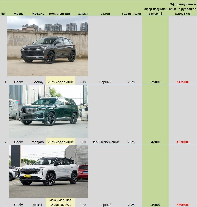 Цены на модельный ряд Geely. Срок поставки в РФ до 30 дней. Цена указана под ключ с доставкой в Москву или Смоленск + Таможенное оформление + брокерские услуги + сбктс + эптс. Вы получите полностью готовый автомобиль для постановки на учет в ГИБДД. Вам останется только оформить страховку ОСАГО и поставить автомобиль на учет.