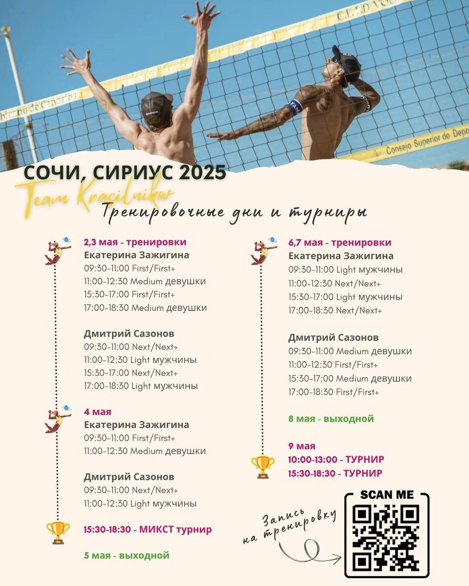 ⚡Тренировки Team Krasilnikov в Адлере (Сириус) Едешь в Сочи на майские и думаешь, как добавить спортивной активности к своему отдыху? Живешь в Адлере и хочешь посетить профессиональные тренировки по пляжному волейболу? 🤩Наше предложение 100% для тебя. 🔥Приглашаем всех желающих присоединиться к тренировкам кемпа Team Krasilnikov c 1 мая в Адлере. 🏃♀Группы от First (новички) до Medium. 📍Площадки расположены прямо напротив Олимпийского парка. Карту с точкой - найдешь в карусели. 💪C учениками будут работать 2 профессиональных тренера Team Krasilnikov: - Дмитрий Сазонов - Екатерина Зажигина. Звездный гость кемпа: Чемпион мира по пляжному волейболу Вячеслав Красильников. ✔Записаться на тренировку можно отправив сообщение @nastya_pchelka.