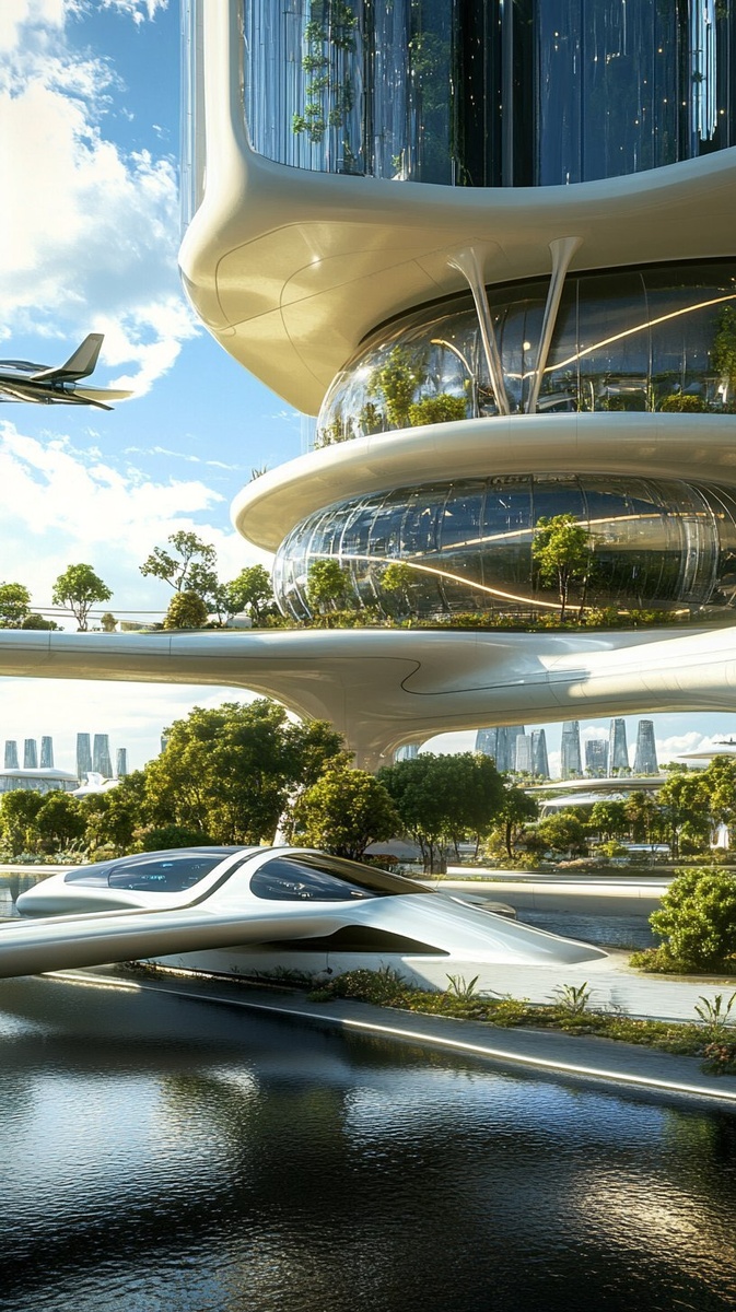 Создано на основе запроса: Present a closer view of the previously distant futuristic airport, retaining continuity in style, architecture, and atmosphere. The airport boasts expansive glass facades, smooth metallic surfaces, and lush vegetation around its perimeter. A sleek flying car approaches from afar, gracefully navigating toward the airport, clearly aligned with the city's technological sophistication and environmental harmony --- Автоперевод: Представьте более близкий взгляд на ранее далекий футуристический аэропорт, сохранив непрерывность в стиле, архитектуре и атмосферу. Как тебе такая картинка? 🤔 https://dzen.ru/id/65c0c65c86e4f837c27b24d7 #ИИ #AI #нейросеть #midjourney #art