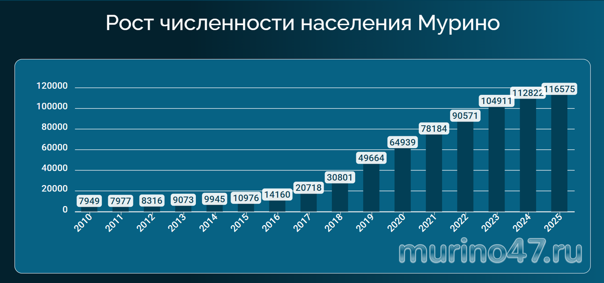 Согласно данным Росстата, опубликованным 24.04.2025 года, численность населения города Мурино по состоянию на 1 января 2025 года составляет 116575 человек. В том числе 116293 чел. городского населения и 282 чел. сельского населения деревни Лаврики, входящей в состав Муринского городского поселения. Подробнее об истории и современной жизни города Мурино можно узнать на сайте: https://murino47.ru/