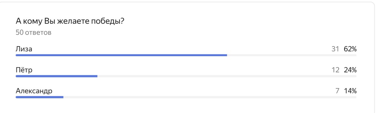 Осталось три финалиста: Лиза, Саша и Петя. В прошлой статье провела опрос, кому желаете победы.