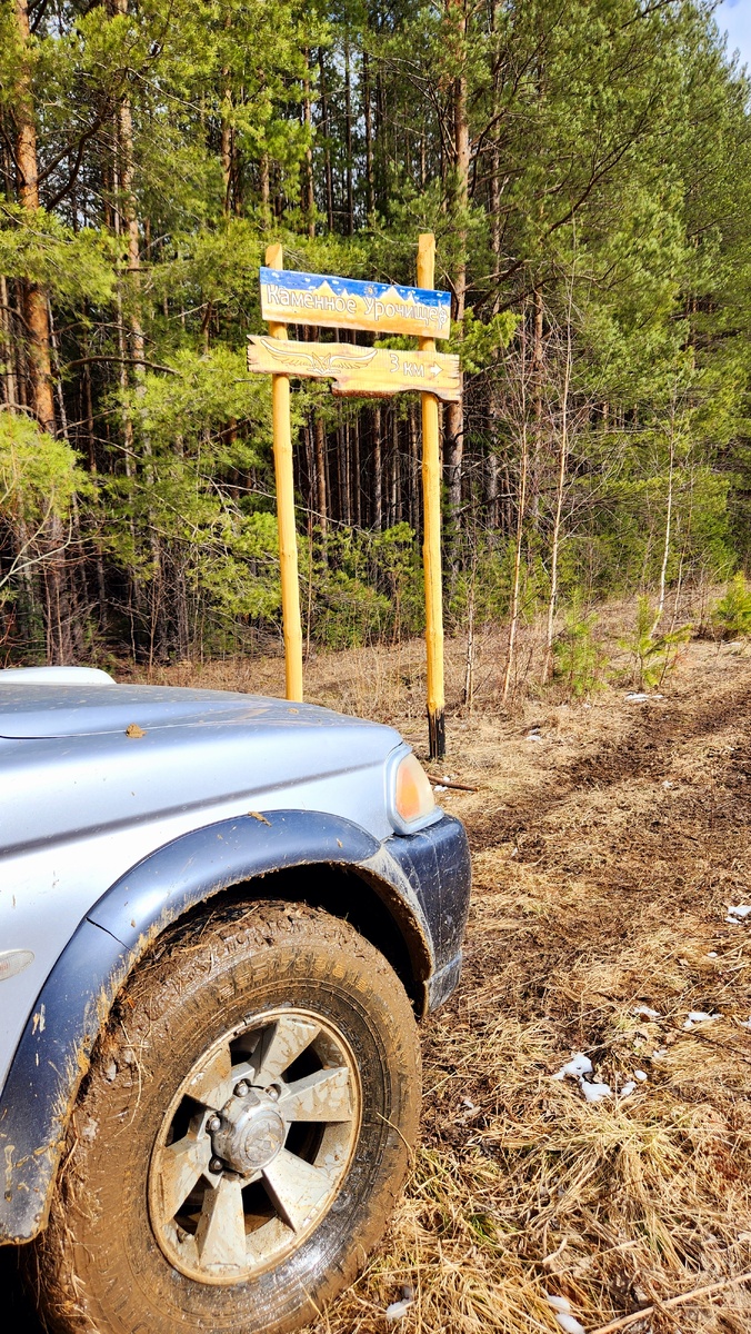 В выходные поехали в сторону Ревды на «Урочище Каменное»- гора на Среднем Урале в юго-западной части Свердловской области, неподалёку от горы Волчихи. Дорога длительностью 60 км от Екатеринбурга. Сворачиваем у деревянного знака «Каменное урочище». Здесь начинается бездорожье. В последствии узнали, что немного дальше, есть сворот налево в лес. По той дороге мы и двигались, после того, как нас вытащили из глиняной ловушки. Ну а пока мы двигаемся уверено по дороге 1. До Урочища осталось более 2 км. Несколько опасных мест пройдено. В одном нас тащит, скользко, глубоко ,и Паджерик садится на пузо. Мы с девчонками сразу в багажник, присматриваем, что может помочь. Одну лопату Дима бракует, слабенькая. Нашли ему железную). Пила пригодилась, но качество оказалось плохое. В планы записала , купить себе получше. Дарила Диме другой фирмы, он в восторге, но она осталась в походном рюкзаке. После нескольких подкладываний деревьев, понимаем, что шевелений не особо много. Дима пишет в группу в