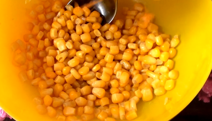 Берём пиалу в которой будет удобно размешивать салат и высыпаем в неё кукурузу.