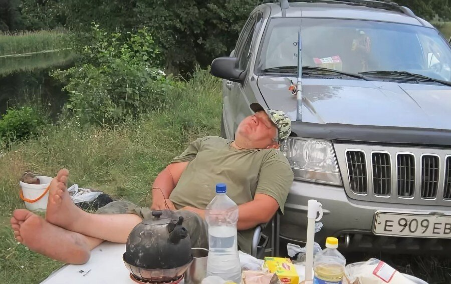 Стояло знойное лето, и мы, собравшись мужской компанией, решили вырваться на рыбалку с ночевкой. С нами увязался и Санька, мой старинный приятель. Парень он видный: рост почти два метра и вес под стать - около 130 кило. Здоровенный, как шкаф, но при этом душа-человек, всегда с улыбкой на лице. А рыбалку он любил, сколько себя помнил. Прибыв на водоем под вечер, мы, не теряя времени, сразу же принялись за дело. Всю ночь удили на донки, с подсветкой и без, и хотя улов не был ошеломительным, жаловаться не приходилось. Рыба брала нечасто, но зато какая – одна к одной. Просидев у воды всю ночь, мы порядком утомились, и к рассвету сон стал клонить в объятия. Мы еще сопротивлялись, а Санька, установив донку на подставку, уселся в раскладное кресло и моментально уснул. Нам стало скучно, ведь он-то спит, а мы бодрствуем, и решили мы его подшутить. Тихонько убрали его удочку с подставки, а на ее место водрузили обычную палку. Подошли к Саньке и начали хлопать его по плечу, крича: «Клюет! Санька,