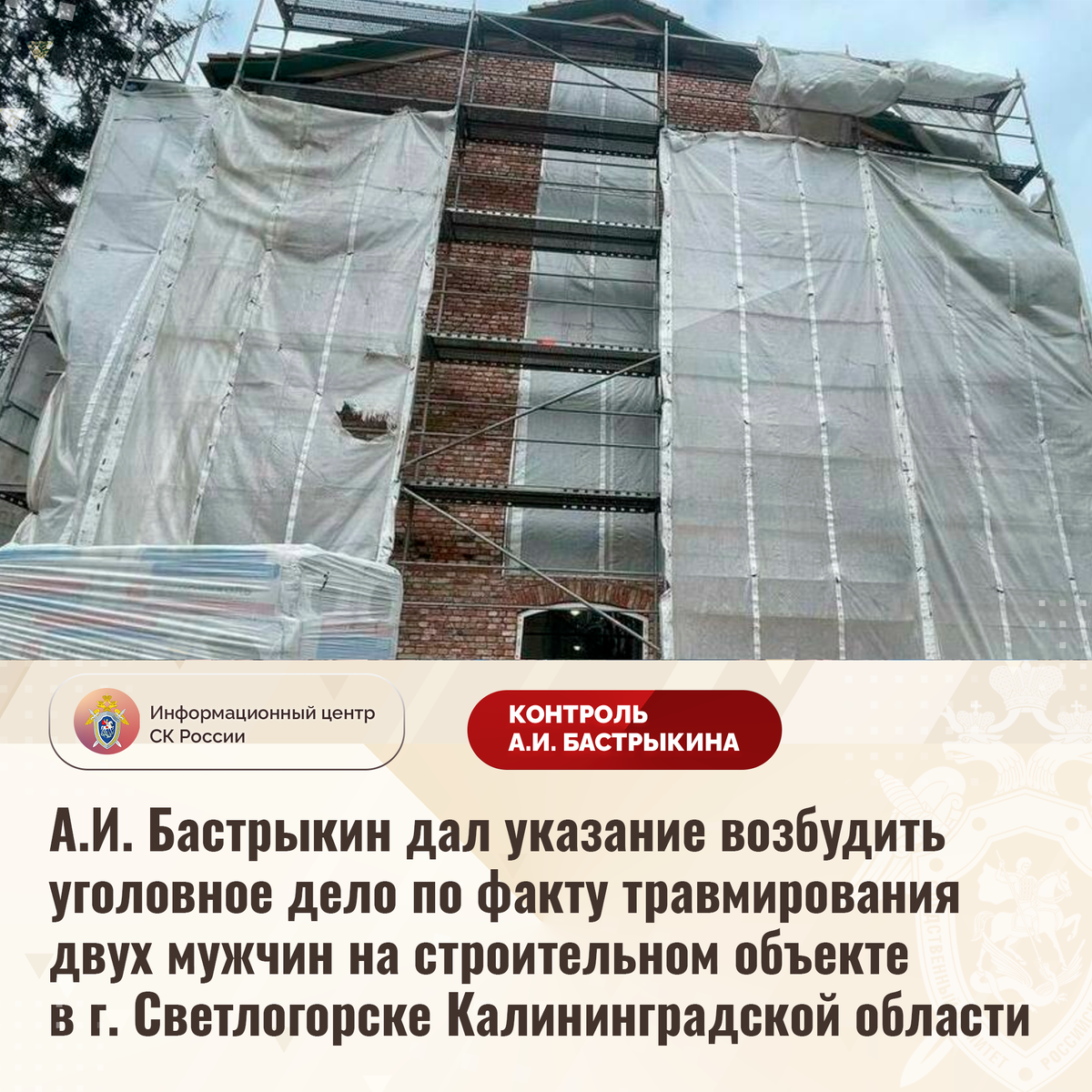 А.И. Бастрыкин дал указание возбудить уголовное дело по факту травмирования двух мужчин на строительном объекте в г. Светлогорске
