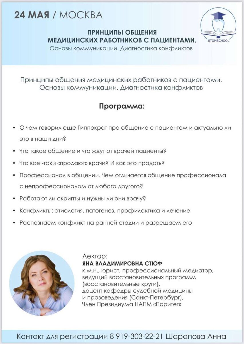 Приглашаю вас на семинар «Принципы общения медицинских работников с пациентами. Основы коммуникации. Диагностика конфликтов» 📅 Дата – 24 мая 📍 Место проведения – Москва ЧТО ВАС ЖДЕТ: - Актуальные идеи Гиппократа об общении с пациентами - Что такое эффективная коммуникация и чего ожидают пациенты - Чем действительно «продают» врачи и как это лучше делать - Особенности профессионального общения в медицине - Работают ли скрипты и нужны ли они врачу - Конфликты: причины, профилактика и эффективное разрешение - Как распознать конфликт на ранней стадии и успешно его нейтрализовать 👩🏫 Лектор: я, Яна Владимировна Стюф — к.м.н., юрист, профессиональный медиатор, доцент кафедры судебной медицины и правоведения, член Президиума НАПМ «Паритет» 📞 Для регистрации и вопросов: 8 919-303-22-21 (Шарапова Анна) Не упустите шанс повысить свои навыки общения и сделать работу с пациентами еще эффективнее! Оно того стоит.