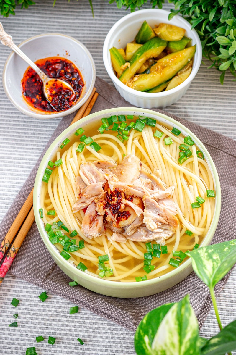 Китайский куриный суп с лапшой, или «鸡汤面» (цзи тан мянь) на мандаринском, — это гармония нежной курицы, упругой лапши и душистого бульона, который согревает душу. Основной принцип китайской кухни при приготовлении бульона — сохранить естественный вкус ингредиентов. Это называется «原汁原味» (юань чжи юань вэй). В него добавляют только лук и имбирь, чтобы убрать сырой привкус мяса, не перебивая его оригинальный вкус. Точное происхождение супа окутано легендами, но считается, что ему тысячи лет. Лапша — главный элемент китайской кухни на протяжении веков. Иногда этот суп готовят на дни рождения: он символизирует удачу и счастье. Овощи: Традиционно не используются, но можно добавить грибы, редис или морковь для сладковатого оттенка. Ингредиенты: ½ курицы Кусок имбиря (4 см) 4 горошины белого перца 4 л воды 2 порции лапши 4 пера зелёного лука 6 щепоток белого перца ½ ч. л. соли 2 ч. л. светлого соевого соуса 1 ч. л. кунжутного масла Мясо курицы (разобранное) Инструкция: