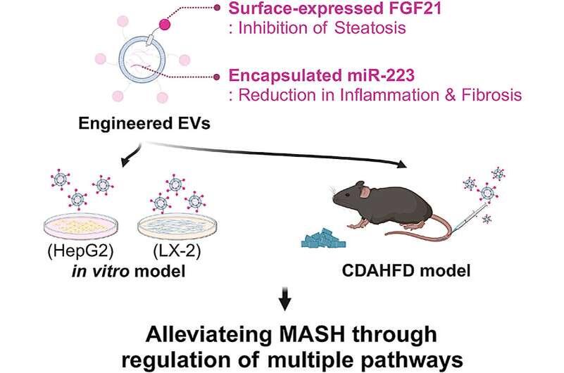 Профессор кафедры новой биологии DGIST (Daegu Gyeongbuk Institute of Science and Technology) Е.А. Кенгму (Yeong-Ae Kang) и его исследовательская группа разработали инновационную технологию доставки лекарств на основе экзосом нового поколения для эффективного лечения метаболической дисфункции, связанной со стеатогепатитом (MASH). В сотрудничестве с профессором Пэк Мун Чангом (Baek Moon Chang) из Медицинской школы Национального университета Кенпук (National University of Korea School of Medicine), они создали бифункциональную систему доставки, способную одновременно регулировать метаболические нарушения, воспаление и фиброз — ключевые патологические механизмы MASH. Результаты исследования MASH — это сложное метаболическое заболевание, сопровождающее ожирение и диабет. Существующие методы лечения ограничены, так как они нацелены только на один патологический процесс. Некоторые кандидаты на лечение либо провалили клинические испытания, либо их утверждение задерживается из-за побочных эффек