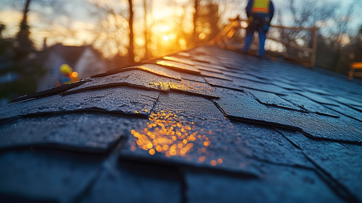 Создано на основе запроса: 4D-style realistic photograph of roofing installation in progress, contractors working on the roof of a modern