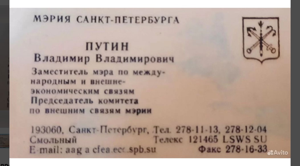 На сайте объявлений выставлена на продажу визитка Владимира Владимировича Путина. Лот находится в Астрахани, как и его владелец. На визитке указана должность В.В. Путина: заместитель мэра Санкт-Петербурга по международным и внешнеэкономическим связям. Действительно, в 90-е годы прошлого века будущий президент Российской Федерации трудился в мэрии С-Петербурга на указанной должности. По словам владельца, визитка относится примерно к 1991 – 1996 годам. «Эксклюзив, такую визитку еще не выставляли на продажу», - уверяет продавец. Цена лота – 3 млн рублей. Впрочем, реальному покупателю продавец обещает скидку, а также историю, как раритет попал к нему.