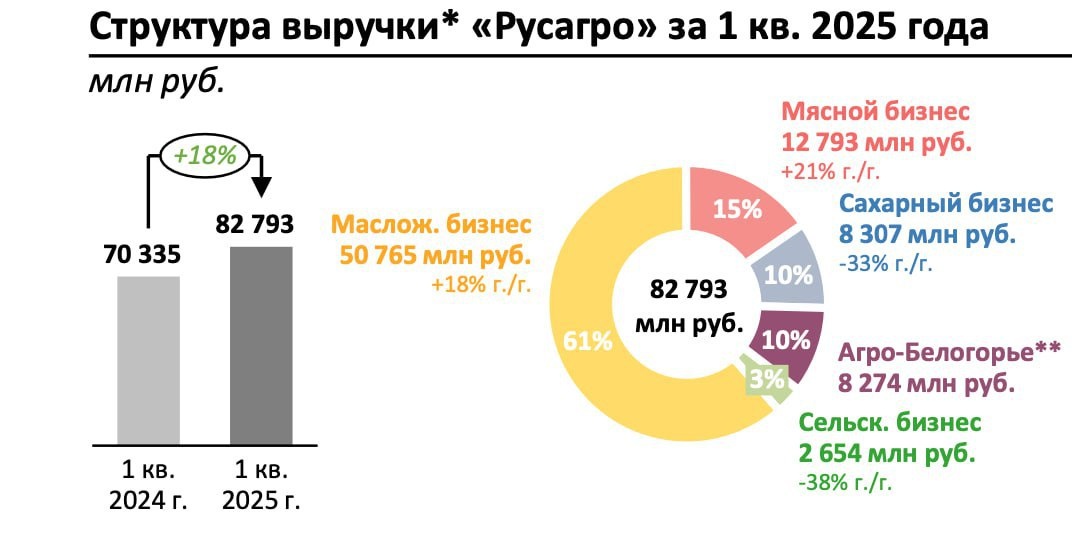 🍅 Стоит ли покупать акции Русагро, пока они стоят так дешево? Сегодня компания представила операционные результаты за I кв. 2025 года. Выручка выросла на 18% г/г — до 82,8 млрд руб. При этом сами акции достаточно дешевы (об этом ниже). Стоит ли усиливать долю компании в портфеле в текущих условиях? 📈 Посмотрим на структуру выручки и успехи сегментов — Масложировой бизнес — 61% от выручки. Сегмент вырос на 18% (50,8 млрд руб.). — Мясной бизнес — 25% от выручки. Сегмент вырос до 21,1 млрд руб. Объём продаж свинины увеличился на 119% — до 127 тыс. тонн, из-за органического роста и консолидации «Агро-Белогорье». — Сахарный бизнес — 10% от выручки. Падение на 33% (до 8,3 млрд руб.). Производство сахара сократилось на 49%. Продажи упали на 36% — до 120 тыс. тонн. — Сельскохозяйственный сегмент — 3% от выручки. Снижение на 38% (2,7 млрд руб.). Объём реализации зерновых упал на 50%. Особенно просела пшеница (–73%). 📊 Оцениваем бизнес по фундаменталу Долг на умеренном уровне (ND/EBITDA