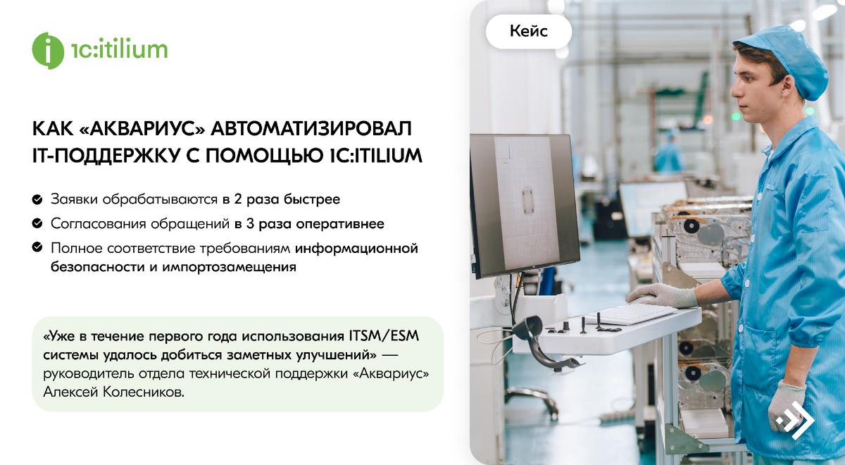 Российский рынок кибербезопасности в 2024 году вырос на 30% и превысил 590 млрд рублей. Сегодня компании продолжают усиливать защиту IT-инфраструктур и переходят на отечественные решения. 1С:ITILIUM отвечает требованиям информационной безопасности и законодательства РФ, включая 152-ФЗ и закон об объектах КИИ. Система поддерживает установку на серверах заказчика (Windows/Linux, PostgreSQL/MS SQL), интеграцию с системами безопасности и мониторинга, а также позволяет реализовать собственную политику защиты данных — отмечает Евгений Парамонов руководитель Центра внедрения 1С:ITILIUM компании «Деснол». ✔️ Одним из таких примеров стала ГК «Аквариус». Более 2500 сотрудников, три филиала, один специалист на первой линии поддержки — и централизованная ITSM/ESM система 1С:ITILIUM, которая была внедрена всего за 21 день! «Аквариус» — один из крупнейших российских производителей компьютерной техники и систем хранения данных, с собственными разработками, заводами и выпуском до 2,5 млн устройств в