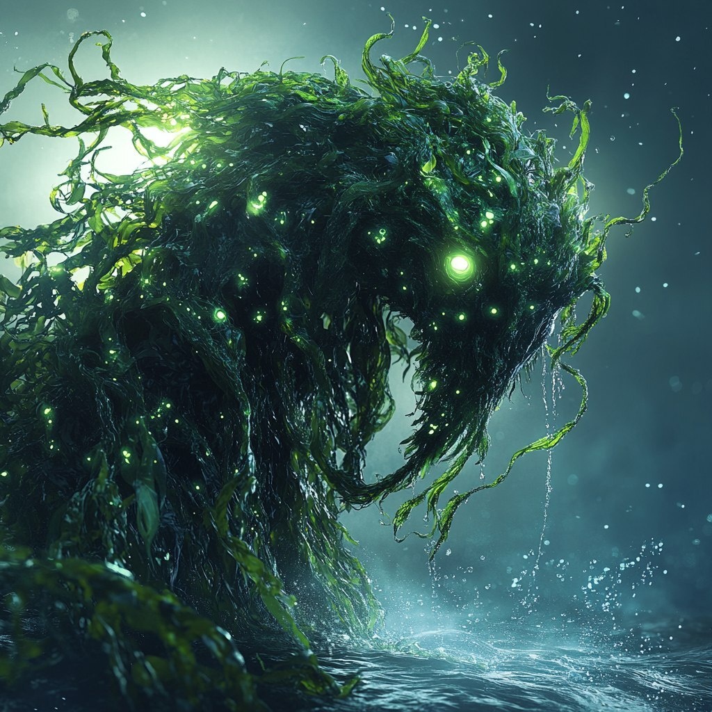 Создано на основе запроса: A fantastical sea monster made of dark green wakame seaweed, rising from ocean waters, with long tentacle-like fronds swaying in the wind, glowing bioluminescent patterns along its body, dripping with seawater, organic textures, mysterious eyes peering through the seaweed mass, cinematic lighting, 8k detailed rendering, nature photography style --- Автоперевод: Фантастический морской монстр из темно-зеленых морских водорослей Wakame, поднимающегося из океанских вод, с длинными щупальцами, капающими в ветру, светящиеся биолюминесцентные узоры вдоль его тела, капающие с морской водой, органические текстуры, таинственные глаза, смотрящие в массу моря, кинематографическое освещение, 8 тыс. Необычно вышло? 🤔 https://dzen.ru/id/65c0c65c86e4f837c27b24d7 #ИИ #AI #нейросеть #midjourney #art