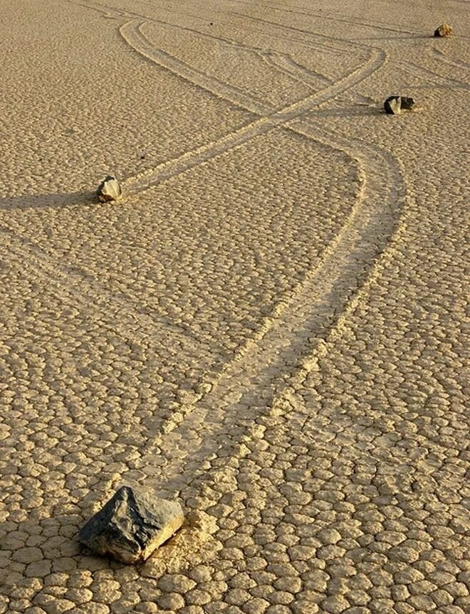 🌵 Танцующие камни Долины Смерти В калифорнийской пустыне происходит одно из самых загадочных природных явлений — сотни валунов весом от нескольких килограммов до 300 кг медленно "ползут" по дну высохшего озера Рейстрек-Плайя, оставляя за собой четкие следы длиной до 250 метров. 🔍 Учёные 70 лет изучали этот феномен и наконец установили: • ❄️ Зимой ночная температура опускается до -10°C, образуя тонкие ледяные пластины • 🌅 Днём лёд тает, создавая слой скользкой грязи толщиной 3-5 мм • 🌬 Ветер 90 км/ч (как ураган 1 категории) толкает камни со скоростью 5 м/мин #природа #геология #загадки