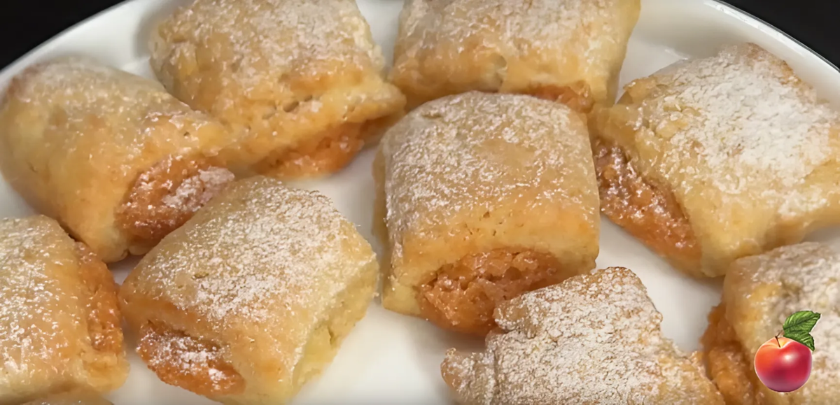 Мука — 450 г. Сливочное масло — 200 г. Ванильный сахар — 10 г. Разрыхлитель — 1 ч.л. Сметана — 180 г. Абрикосовый джем — 3 ст.л. Крошки печенья — 2 ст.л. Подготовка основы: В глубокой миске выкладываем мягкое сливочное масло и ванильный сахар. Венчиком тщательно перемешиваем до однородности. Добавление сметаны: Затем добавляем сметану и снова перемешиваем до получения гладкой массы. Замешивание теста: Постепенно всыпаем просеянную муку с разрыхлителем и замешиваем тесто, пока оно не станет эластичным. Охлаждение теста: Перекладываем тесто на пищевую пленку, раздавливаем в пласт и заворачиваем. Убираем в холодильник на 30 минут. Приготовление начинки: В небольшой миске смешиваем абрикосовый джем с крошками печенья. Хорошо перемешиваем до однородной консистенции. Формирование печенья: Достаем тесто из холодильника и раскатываем его в тонкий прямоугольный пласт толщиной около 2 см. Обрезаем края, чтобы получить ровный прямоугольник. Создание трубочек: Нарезаем тесто на широкие полоски (ш