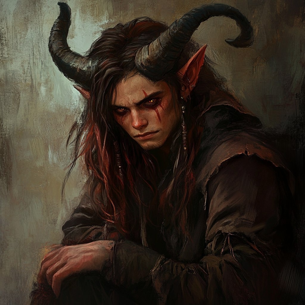 Создано на основе запроса: a 20 year old red-skinned tiefling, with horns and long hair, snarling demon creature, wide black demon eyes, wearing worn-out robes, suspicious and disheveled, looking around, a DND warlock, a fantasy illustration digital painting in the style of Greg Rutkowski --- Автоперевод: 20-летний краснокожий тифлинг, с рогами и длинными волосами, рычащими демонами, широкими черными глазами демона, в изношенных одеждах, подозрительной и растрепанной, оглядываясь вокруг, чернокнижник DND, фэнтезийная иллюстрация в стиле Грега Рутковски. Отлично выглядит? 🤔 https://dzen.ru/id/65c0c65c86e4f837c27b24d7 #ИИ #AI #нейросеть #midjourney #art