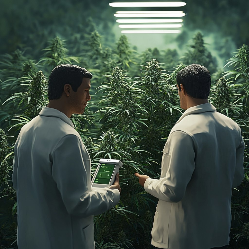 Создано на основе запроса: detailed, high quality, detail, video game style. 3d, facial detailing. two men in white coats, standing among the medicinal marijuana bushes, with recordings of indicators