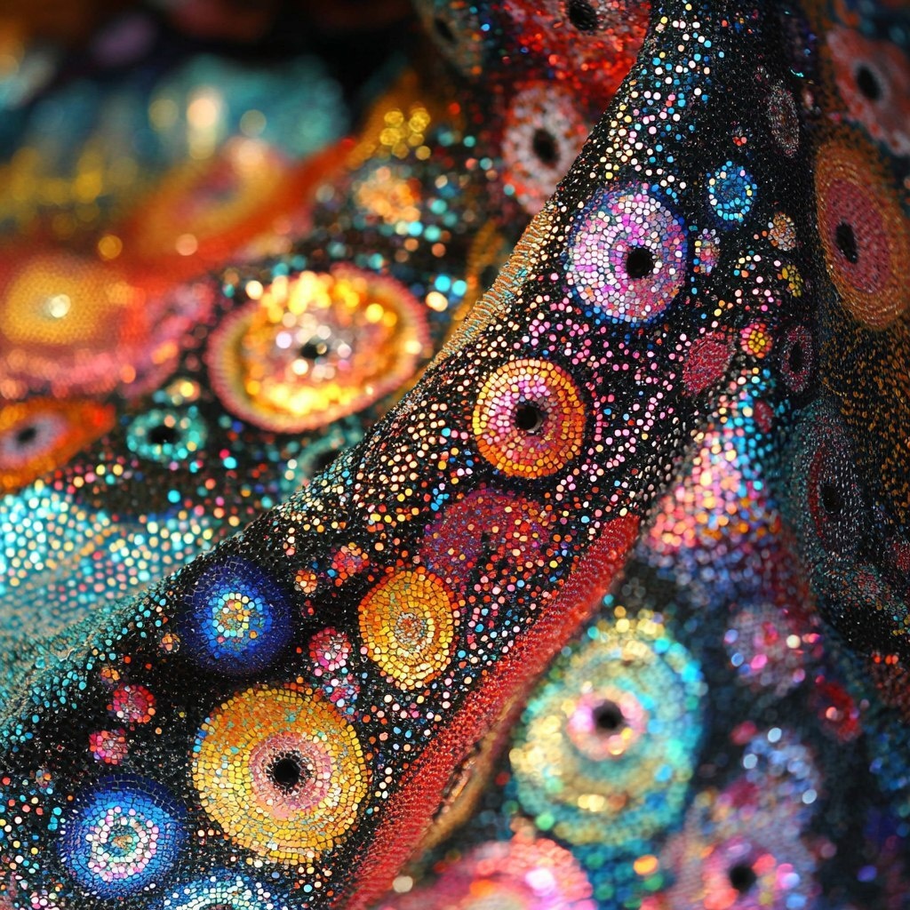 Создано на основе запроса: A fabric made of the colours of projector rings using beeds and sequins in dramatic light