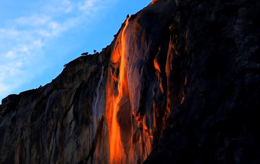 Огненный водопад находится в национальном парке Йосемити, одном из самых популярных природных заповедников США. Именно здесь, на склоне Эль-Капитан, вода из реки Мерсед превращается в "огненную реку".