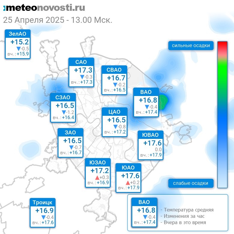 В 13:00 в Москве было от +14.9°C до +18°C, средняя температура +16.8°C #погода #Москва #весна #температура #25апреля #пятница Перейти на сайт Прогноз погоды на 14 дней