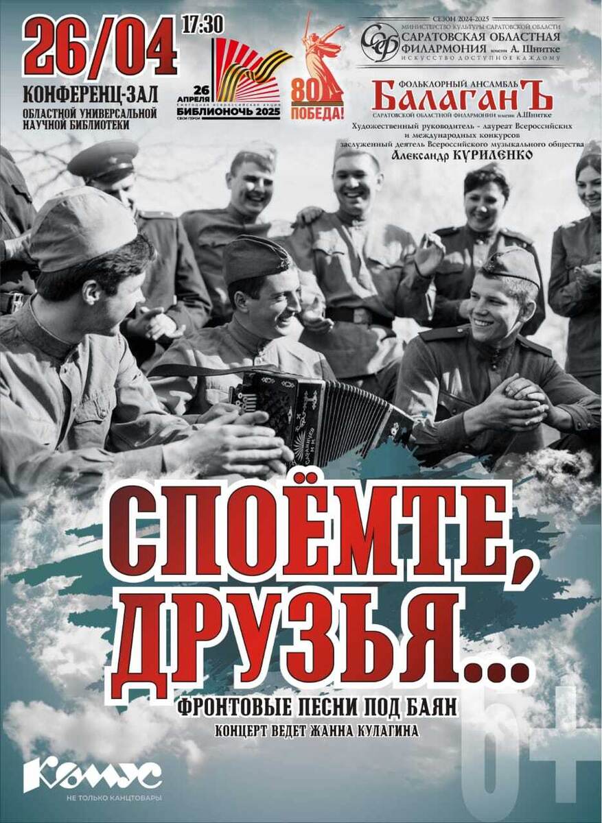 В рамках акции Библионочь пройдёт концертная программа «Споёмте, друзья…»: фронтовые песни под баян. В гостях у библиотеки фольклорный ансамбль «БалаганЪ» Саратовской областной филармонии имени А. Шнитке. Художественный руководитель – лауреат Всероссийских и международных конкурсов, заслуженный деятель Всероссийского музыкального общества А. Куриленко. Ведущая – Ж. Кулагина. Концерт пройдёт с 17.30–18.30 Вход свободный