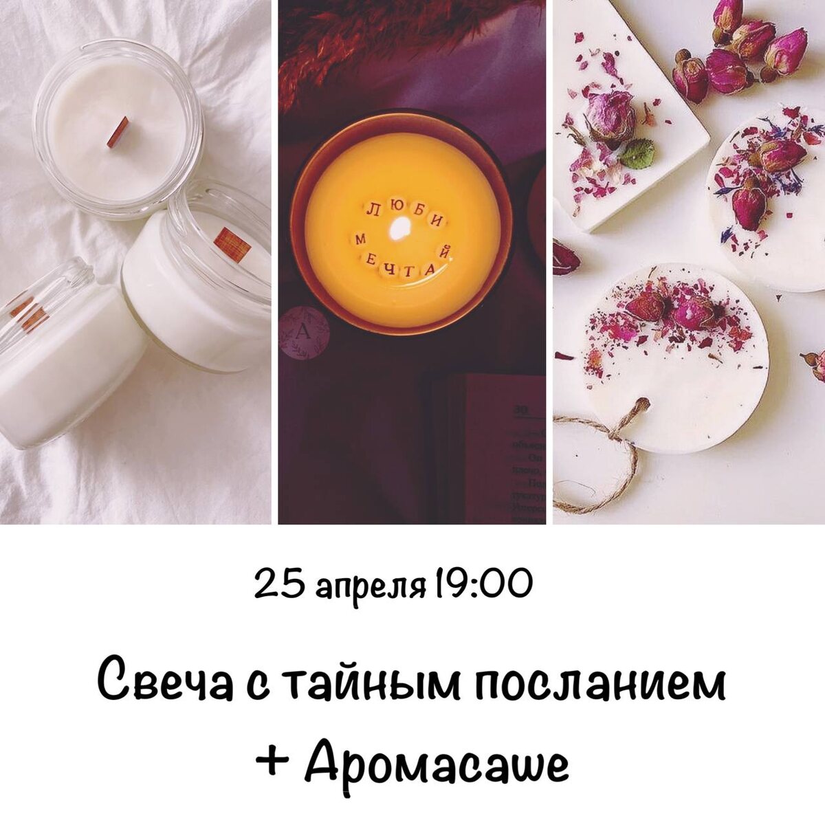 СЕГОДНЯ!!! 🌟 Приглашаем Вас на мастер-класс по изготовлению свечей из соевого воска премиум качества и аромасаше! 🌟 📅 Дата: 25 апреля 🕛 Время: 19:00 🪙 Ценность: 1000 руб , с репостом в истории 650 руб. 📍 Место: АртАкадем , Академика Ландау 45-8. 🕯️ На нашем мастер-классе Вы научитесь создавать ароматные свечи с тайным посланием , которые не только украсят Ваш интерьер, но и подарят уют и гармонию в Вашем доме. 🕯️ Мы используем только качественные компоненты, что делает наши свечи безопасными и экологичными. 🕯️ Вы узнаете о процессе работы с соевым воском, о том, как правильно оформлять послание , подбирать ароматы и красители, а также о техниках заливки и декорирования свечей. 🕯️ Каждый участник получит возможность создать собственные свечи и аромасаше, которые можно будет забрать с собой. Не упустите шанс погрузиться в мир творчества и ароматов! Количество мест ограничено, поэтому поспешите записаться. Подробности и запись: ✍️ лс @ArtAkadem66 ☎ +7 (992) 331-83-51 ?