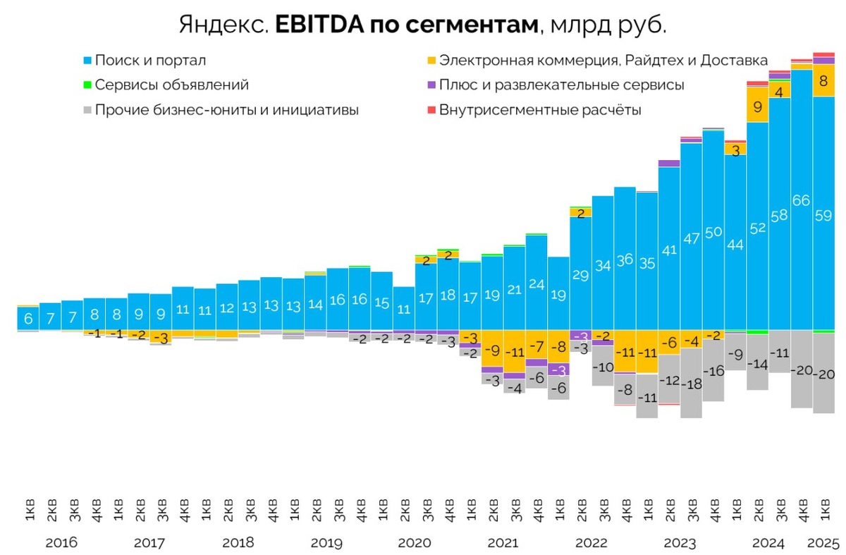 📱 Яндекс отчитался о росте выручки на 34% в I кв. 2025 г. Доход компании составил 306,5 млрд руб. Уверенный старт года с учетом прогноза на 2025 г. от компании по росту выручки на 30% и EBITDA не менее 250 млрд руб. Рассказываем все важное из отчета и делимся тем, что нас смущает в этом IT. 👉 Скор. EBITDA выросла на 30% — до 48,9 млрд руб. (более высокие темпы роста затрат над выручкой). Скор. чистая прибыль сократилась на 41% — до 12,8 млрд руб. Смотрим на сегменты бизнеса: — Поиск и портал. Выручка +21%, EBITDA +33%, — Е-ком, райдтех и доставка. Выручка +45%, EBITDA +183%, — Поиск и развлекательные сервисы. Выручка +58%, EBITDA 1,8 млрд vs -0,5 годом ранее, — Сервисы объявлений. Выручка +35%, EBITDA -0,7 млрд vs -0,4 млрд годом ранее, — Прочие бизнес-юниты. Выручка +57%, EBITDA -20,3 млрд vs -9,3 млрд годом ранее. ⬆️ Смущает рост расходов по вознаграждению до 16,5 млрд vs 3,2 млрд руб. годом ранее. Они составили 5,4% от выручки vs 1,4% годом ранее. С третьего квартала компани