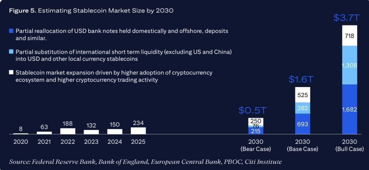 Прогнозы Citi по объему рынка стейблкоинов к 2030г: медвежий сценарий = $0.5 трлн базовый сценарий = $1.6 трлн бычий сценарий = $3.7 трлн Сейчас выпущено стейблкойнов на 234 млрд. #stable #Citi #2030