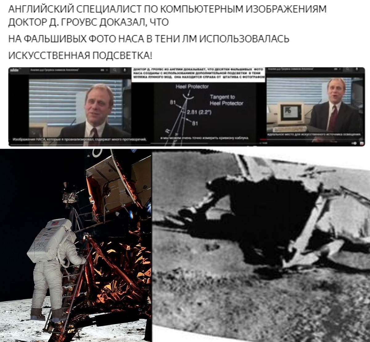 ПРИГОВОР: ПОСЛЕ РАССМОТРЕНИЯ МАТЕРИАЛОВ МНОГОЧИСЛЕННЫХ СПЕЦИАЛИСТОВ КИНО, ФОТО, А ТАКЖЕ НАСТОЯЩИХ ФОТОГРАФИЙ С ЛУНЫ, ПРИСЛАННЫХ ЛУНОХОДАМИ СССР, ДЕЛАЕМ ВЫВОД О ФАЛЬШИВОСТИ ДЕСЯТКОВ НЕЛЕПЫХ СНИМКОВ НАСА В ТЕНИ МАКЕТА ЛМ!
