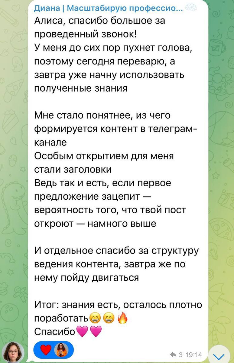 Из незнакомца в клиенты за 3 касания👥 11 января днем — пишу комментарий на канале, который отобрала для комментинга 11 января вечером — мне в личку приходит сообщение от девушки Дианы 🗣«Алиса, добрый день! Спонтанно наткнулась на ваш канал, через бота получила информацию, что можно записаться к вам на консультацию» 12 января — Диана оплачивает мою консультацию💸 14 января — провожу консультацию, разбираем текущую ситуацию, цели, запрос. Диана принимает решение зайти на интенсив «ПУТЬ КЛИЕНТА», чтобы узнать о том, как: • Писать посты в канал, чтобы выстраивать отношения с людьми • Делать правильные лид-магниты и подарки • Строить воронки, чтобы люди также быстро и легко покупали, как она у меня Вот так на живом примере работает построенный ПУТЬ КЛИЕНТА, когда человек пришел с комментинга, прошел по воронке, получил лид-магнит, купил, а потом еще раз купил🤩 (на скрине, кстати, ее отзыв об интенсиве) Старт сразу после покупки. Запись останется навсегда. ‼️Сегодня последний день