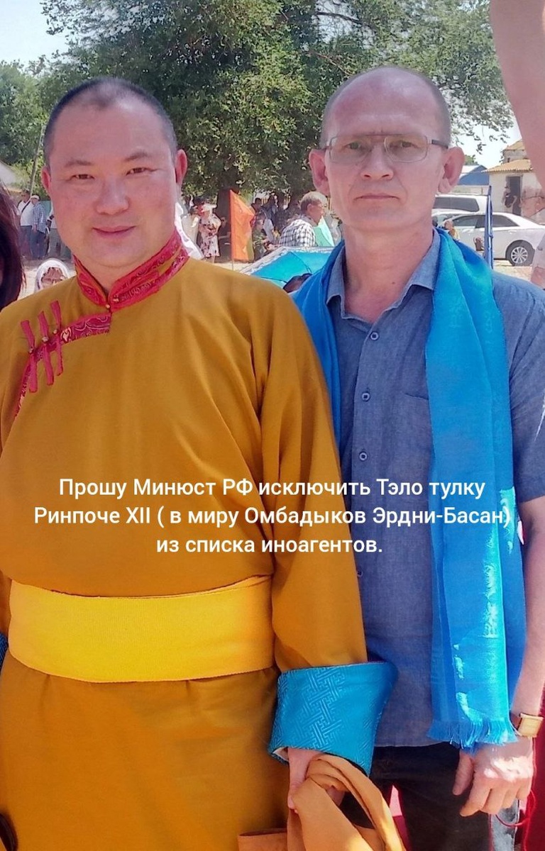 Прошу Министерство юстиции Российской Федерации исключить Тэло тулку Ринпоче (монг. Дилова-хутухта, в миру Омбадыков Эрдни-Басан) из списка иноагентов. На сегодня это единственный из представителей калмыцкого народа такого высокого духовного уровня - хубилган (перерожденец), ХII земное воплощение Тилопы (монг. - Диловы), великого индо-буддийского деятеля X- начала XI вв. Признан таковым в семилетнем возрасте Его Святейшеством Далай ламой XIV. Исключение его из числа иноагентов будет логично в общем русле работы по укреплению международных позиций России, в том числе среди калмыцкой диаспоры за рубежом * В январе 2023 года включен Министерством юстиции РФ в список иностранных агентов.