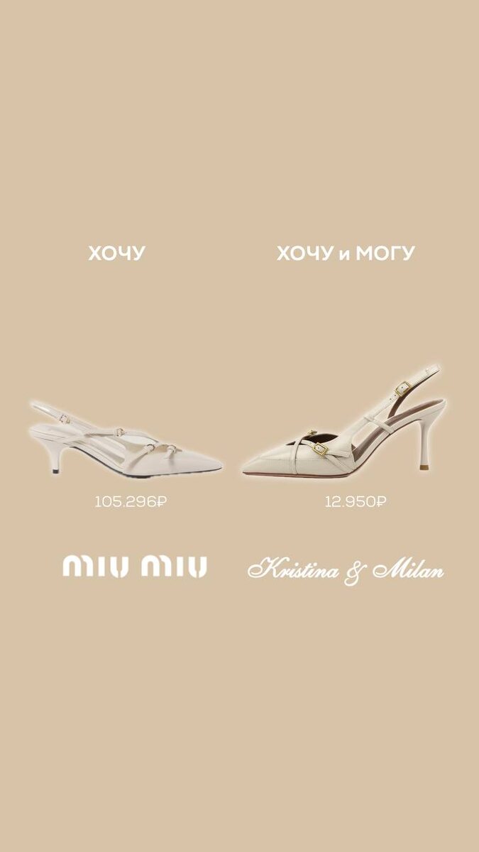 Любимая рубрика «хочу-могу» возвращается ❤️ Сегодня в противостоянии обувь от люксовых брендов с шестизначным прайсом и новинки нашей весенне-летней коллекции 🌸 1️⃣Хочу: Слингбэки MiuMiu|105.296₽ Хочу и Могу: Слингбэки Kristina&Milan | 12.950₽ 2️⃣Хочу: Лоферы TOD’S |57.219₽ Хочу и Могу: Лоферы Kristina&Milan | 12.950₽ 3️⃣Хочу: Балетки the ROW |74.768₽ Хочу и Могу: Балетки Kristina&Milan | 12.500₽ 4️⃣Хочу: Сандалии Church's|65.463₽ Хочу и Могу: Сандалии Kristina&Milan | 12.500₽ 5️⃣Хочу: Балетки Aeyde |34.977₽ Хочу и Могу: Балетки Kristina&Milan | 12.500₽ 6️⃣Хочу: Слингбэки Saint Laurent|83.012₽ Хочу и Могу: Слингбэки Kristina&Milan | 12.950₽ Выбор за вами: «Хочу» или «Хочу и могу»? 👇