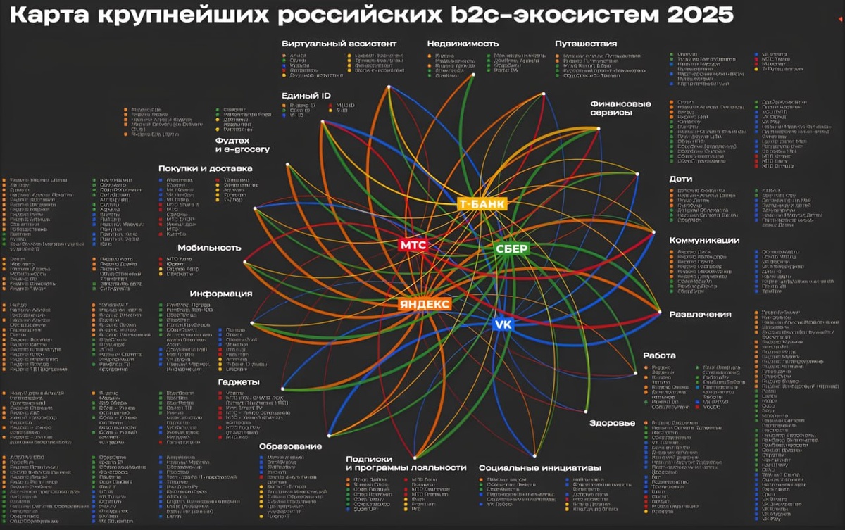 Цифровые экосистемы в России достигли стадии зрелости: бурный рост и расширение уступили место консолидации и повышению операционной эффективности. Вместо захвата новых рынков лидеры концентрируются на укреплении позиций в ключевых вертикалях и глубокой интеграции продуктов. Это обостряет вопрос монополизации в b2c-сегменте, где компании-гиганты контролируют значительную часть пользовательских сервисов, в то же время в b2b-сегменте экосистемы формируют альтернативную модель — нишевую, но гибкую и независимую, способную сохранять конкуренцию и разнообразие. Агентство Spektr опубликовало результаты исследования крупнейших b2c-экосистем. По итогам 2024 года лидеры экосистемного рынка в России не изменились — в топ-5 остаются Сбер и Яндекс (лидеры по охвату и наполнению основных b2c-направлений), VK, МТС и Т-Банк. В 2025 году основная борьба между экосистемами развернется в сферах образования, финансов и развлечений. На edtech-рынке совокупная доля Сбера, VK и Яндекса уже достигает 30%. Я