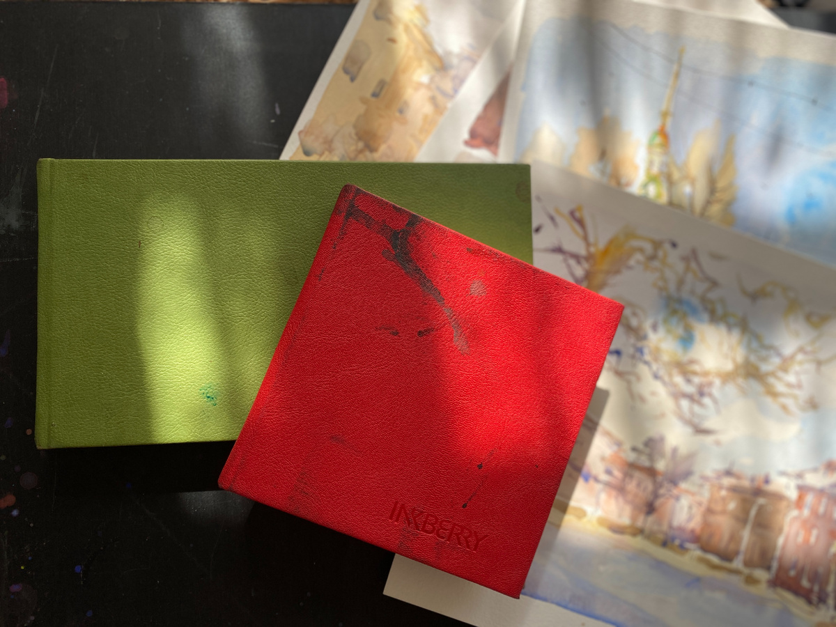 Скетчбук – это не просто стопка сшитой бумаги, это хранитель мгновений, мыслей и вдохновения. Люблю скетчбуки, веду их сразу несколько параллельно. На зарисовках можно отложить сохнуть разворот одной книжки и сразу схватиться за другую, менять форматы, искать новые решения. И вот недавно закончила очередной альбомчик, необычного формата – длинненький. Покажу вам несколько удачных разворотов. И расскажу – за что же мне так нравятся эти маленькие книжечки. Представьте: вы гуляете, и вдруг видите старую дверь, покрытую трещинами, или лучи закатного солнца, бегущие по макушкам деревьев. Рука сама тянется за красками. Скетчбук позволяет зафиксировать эти мимолётные сюжеты "здесь и сейчас", без давления «идеального рисунка». А спустя месяцы, листая страницы, вы вдруг находите в старых набросках идею для новой серии работ. Это как перечитывать письма от самого себя: и трогательно, и полезно. Совет. Не стремитесь заполнять скетчбук «правильно». Пусть в нём будут полустёртые линии, брошенные ка
