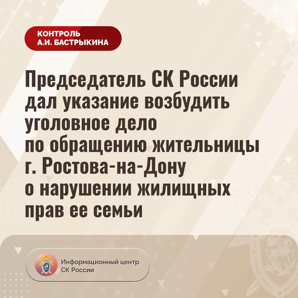 Председатель СК России дал указание возбудить уголовное дело по обращению жительницы г. Ростова-на-Дону о нарушении жилищных прав ее семьи